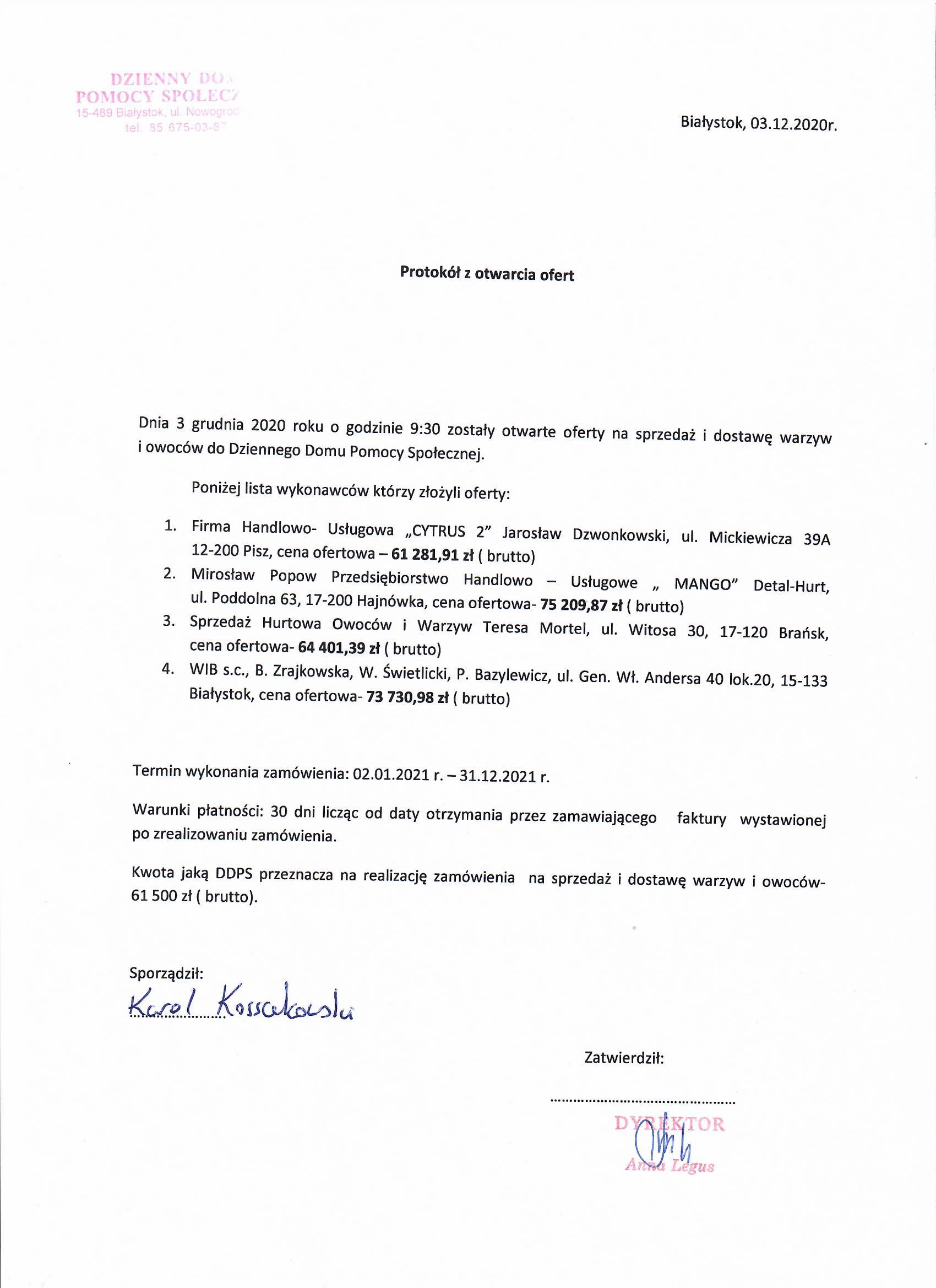 Informacja o wynikach przetargu nieograniczonego na sprzedaż i dostawy warzyw i owoców na potrzeby DDPS w Białymstoku w 2021 roku